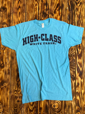 Lightweight 100% Cotton Fine Jersey Tee Shirt. Sky blue with team High Class White Trash ® navy blue print full front print & OG oval on back yoke.