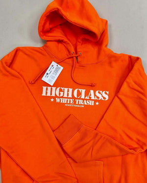 Turn heads and stand out with the High-Class White Trash Stamp Print Unisex Heavyweight Pullover Hoodie in Blaze Orange—because bold never blends.