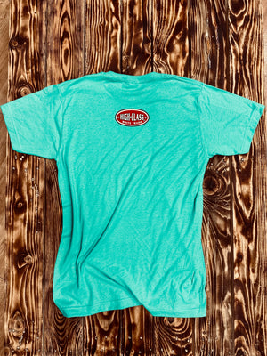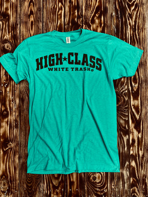 Lightweight 100% Cotton Fine Jersey Tee Shirt. Mint with team High Class White Trash ® dark green print full front print & OG oval on back yoke.
